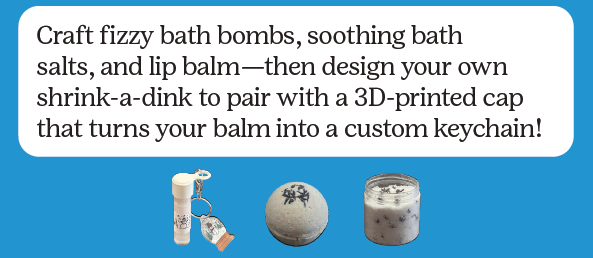 Step into the Winter Wonder Lab for a hands on science and self care adventure! When you register, a special kit will arrive at your door packed with everything you need to craft, learn, and create. Inside you will discover the ingredients and tools to create fizzy bath bombs, relaxing bath salts, and soothing lip balm. Then take it to the next level with an exclusive 3D-printed cap that transforms your lip balm into a custom keychain. Each keychain will also feature a one-of-a-kind shrinky-dink charm you design yourself, making it completely unique and only available in this program!