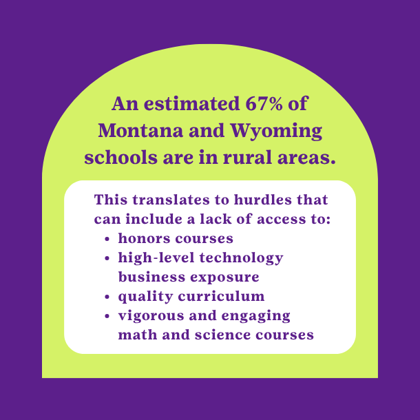 An estimated 67% of our Montana and Wyoming schools are in rural areas. This translates to hurdles that can include a lack of access to honors courses, high-level technology business exposure, as well as limited access to quality curriculum and vigorous and engaging math and science courses.