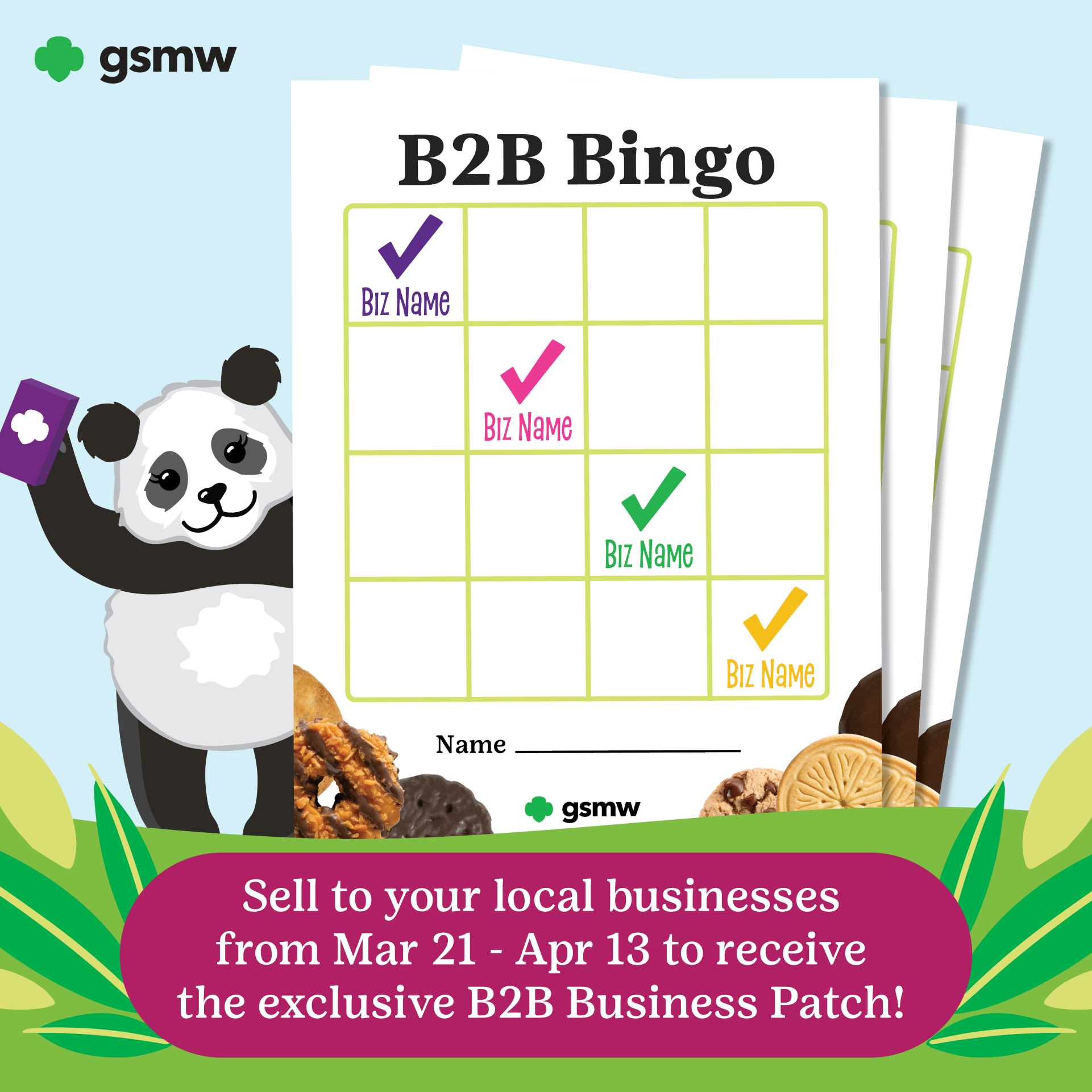 From March 21 to April 13, each time you sell to a business, write the business name in a blank square on your B2B Bingo Sheet.